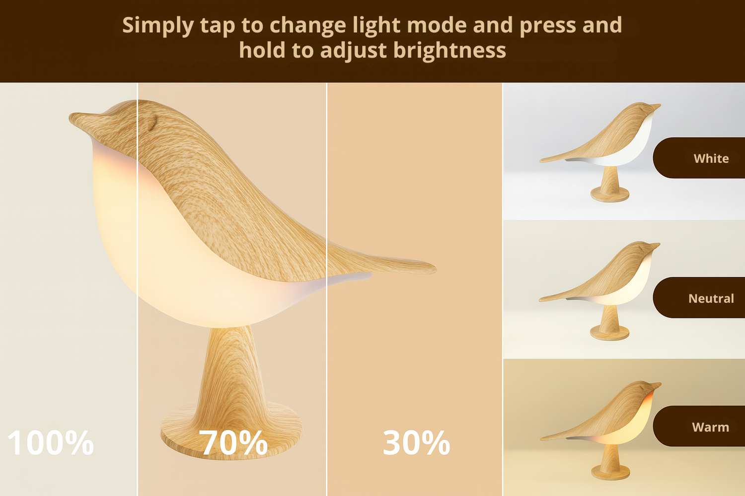 BirdZen features a charming bird-shaped design, delicately perched on a light wood-effect base. Its poetic and soothing appearance evokes natural beauty, adding a timeless touch to your bedroom.